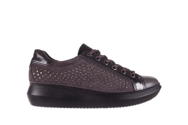 Trampki marki Imac wykonane z połączenia skóry naturalnej ze skórą naturalną zamszową w kolorze szarym.Wkładka wykonana ze skóry naturalnej, natomiast wyściółka z miękkiego materiału w kolorze czarnym. Trampki na wygodnym 4,5 -centymetrowym podwyższeniu. Podsówka na 2,5 cm podwyższeniu. Z przodu sznurowane. Z zewnętrznej strony cholewki znajdują się srebrne dżety. Tylna, górna część cholewki, czubek języka […]