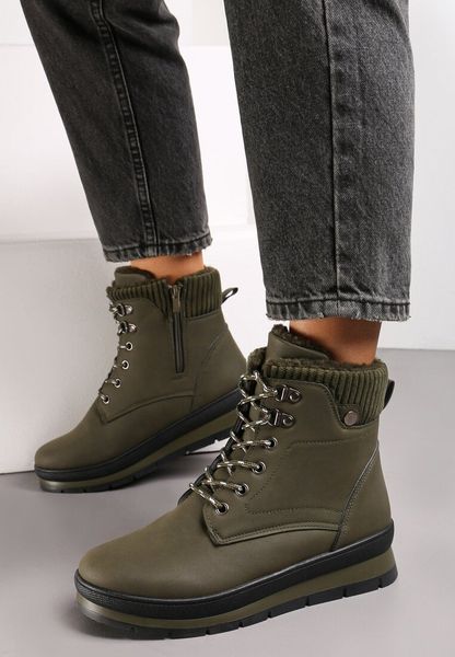 Zielone Sznurowane Traperki z Ekoskóry z Futerkiem i Ozdobną Wstawką Pisanara