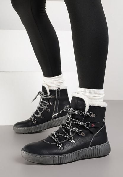 Czarne Botki Traperki z Ozdobnym Sznurowaniem i Tłoczoną Podeszwą Fasitta