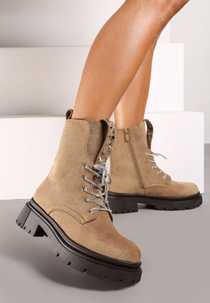 Ciemnobeżowe Botki Typu Traperki z Imitacji Zamszu na Platformie Ozdobione Ćwiekami przy Języku Evirira