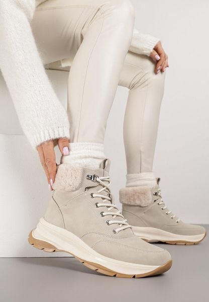Beżowe Trapery na Grubej Podeszwie Ozdobione Futerkiem Furitte