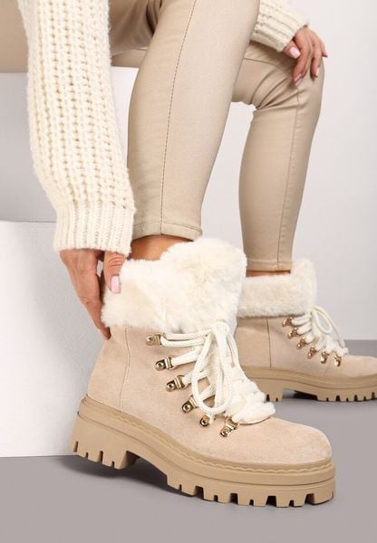 Beżowe Traperki na Tłoczonej Podeszwie Ozdobione Futerkiem Taiva